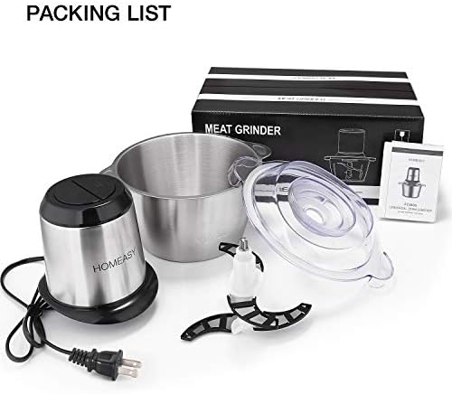 HOMEASY electric meat grinder comes with real power 350W, which is more efficient and fast. 4 stainless steel blades design allows the upper and lower blades to evenly chop food from every angle of 360 degrees. The electric chopper is an ideal gift for your friend and family.
