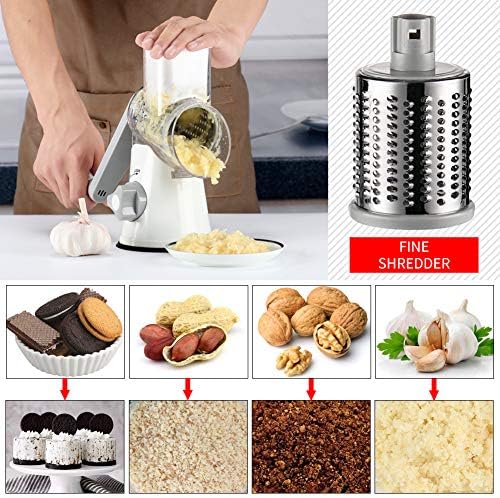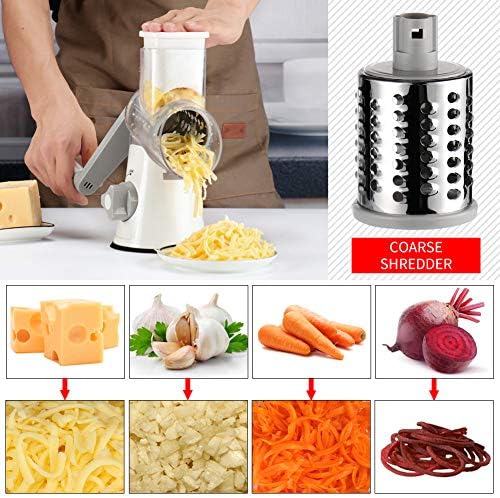 ????High Efficient Cheese Grater: Crank 1 circle means 12 cuts by traditional. You will SAVE much TIME to prepare you meals. The cheese shredder is perfect for cheese, hash brown, potatoes, veggies, radish, carrot, zucchini, cucumbers, nuts, cookies and more. Need special attention are: soft cheese, barrel with slicing or Coarse Shredder. Hard cheese, use Fine Shredder.